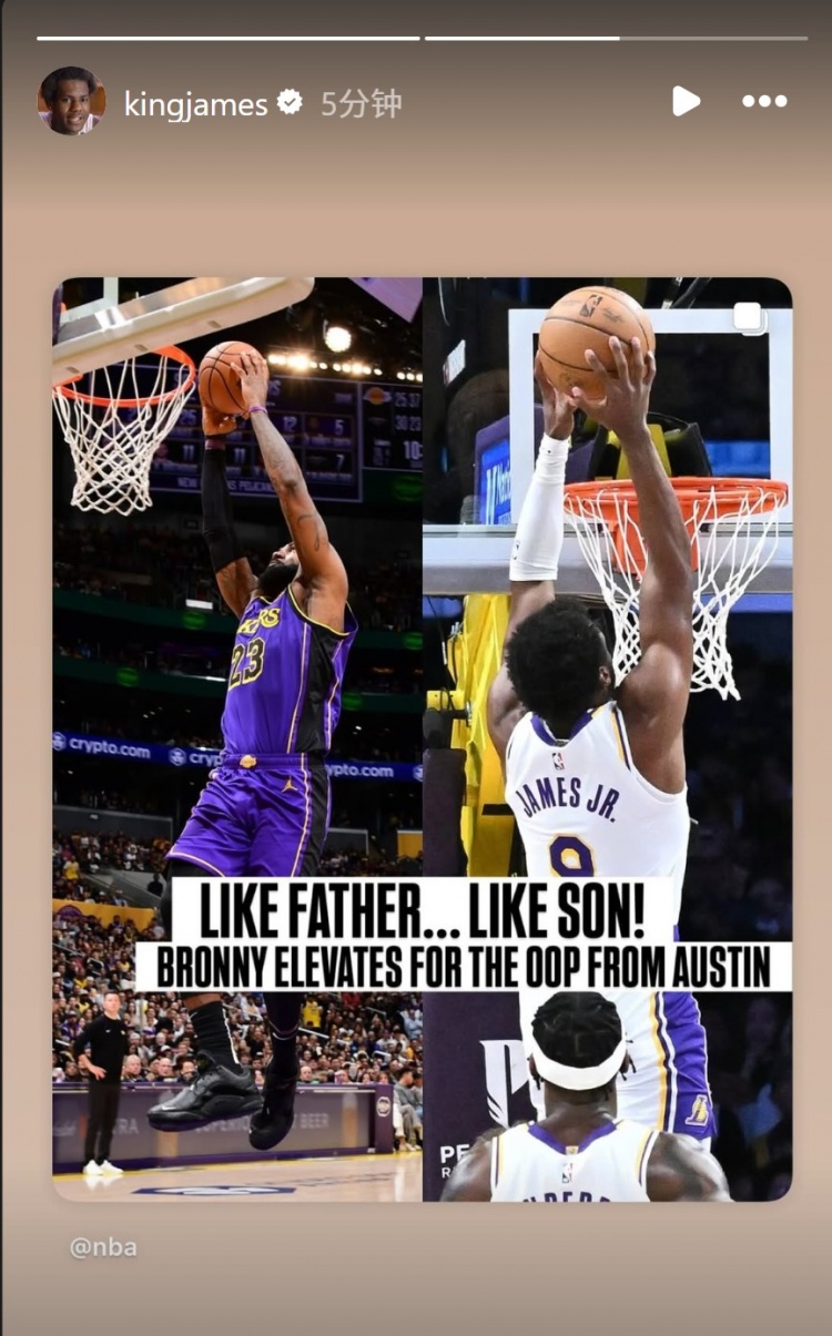 NBA官方晒图:“有其父必有其子,布朗尼高高跃起接里夫斯助攻空接暴扣。”詹姆斯在INS上进行了转发。